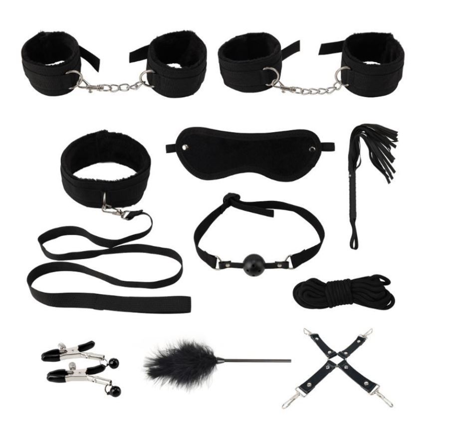 Kit 10 Pcs Bondage Bdsm Preto para Submissão Fetiche com Chicote e pluma